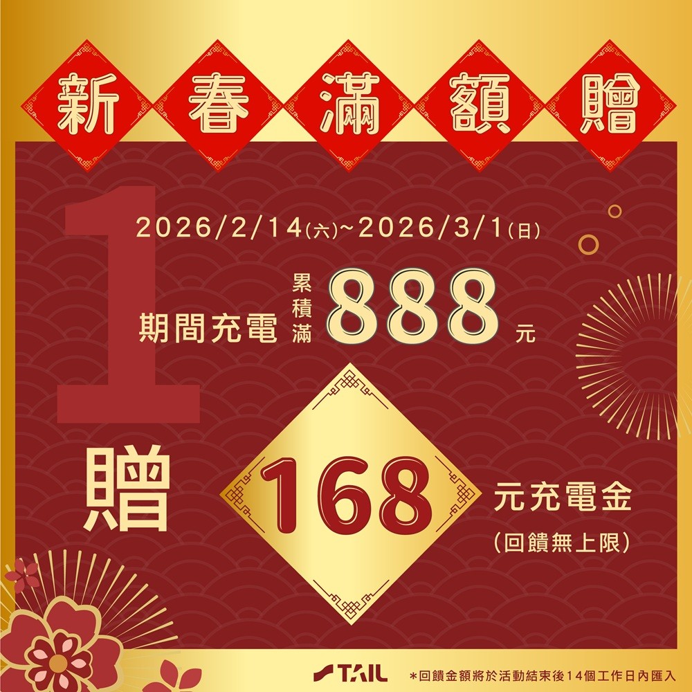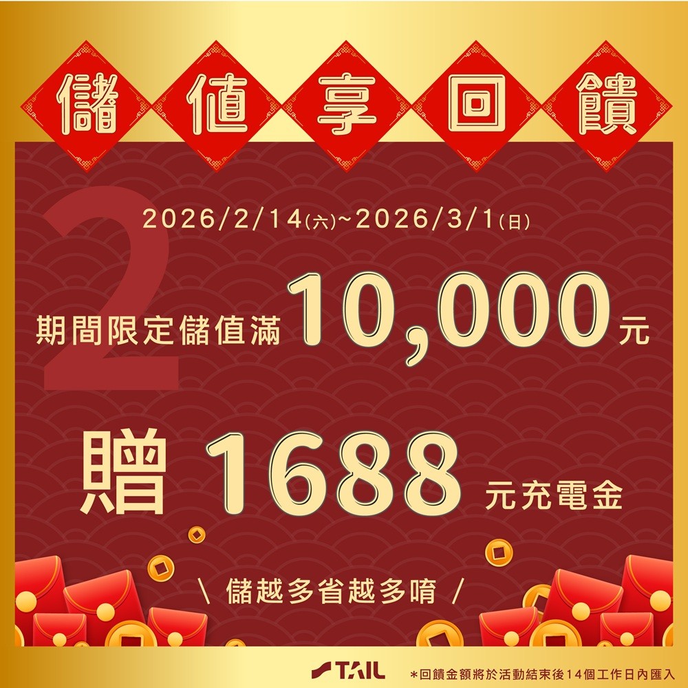🔹活動內容: 使用 TAIL 特爾電力 APP 儲值滿 $10,000 元,即贈 $1,688 元充電金。