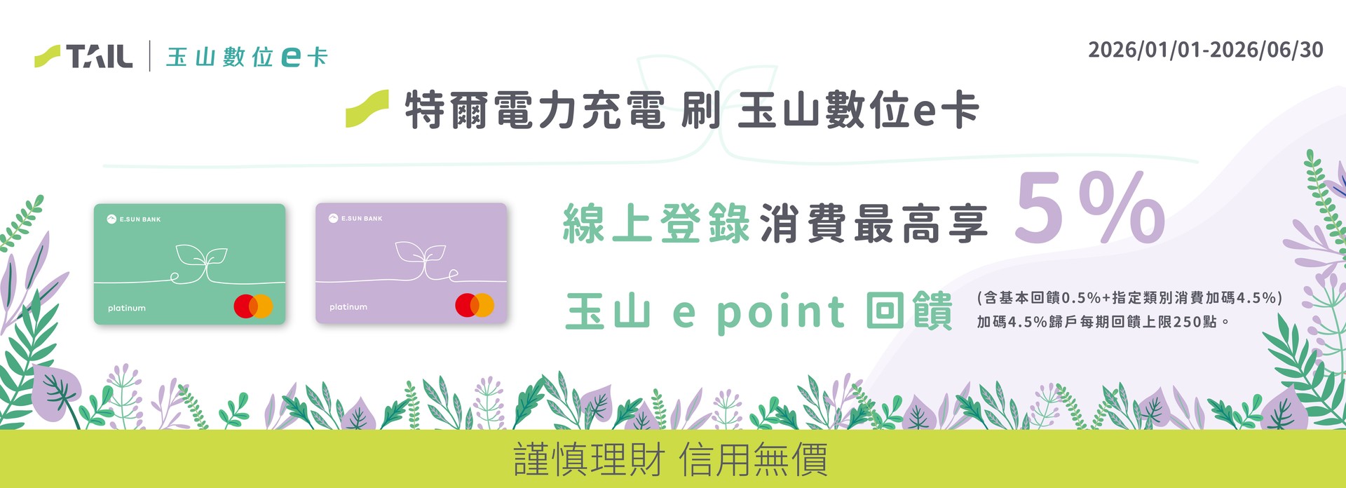 即日起使用「玉山數位 e 卡」於特爾電力消費,可享有專屬最高5%玉山 e point 回饋